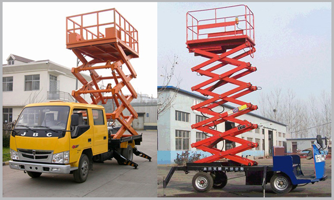 *车载式液压升降平台采用各种车底盘加固平台底架,利用本车动力,在变速箱上输出驱力油泵来操作。